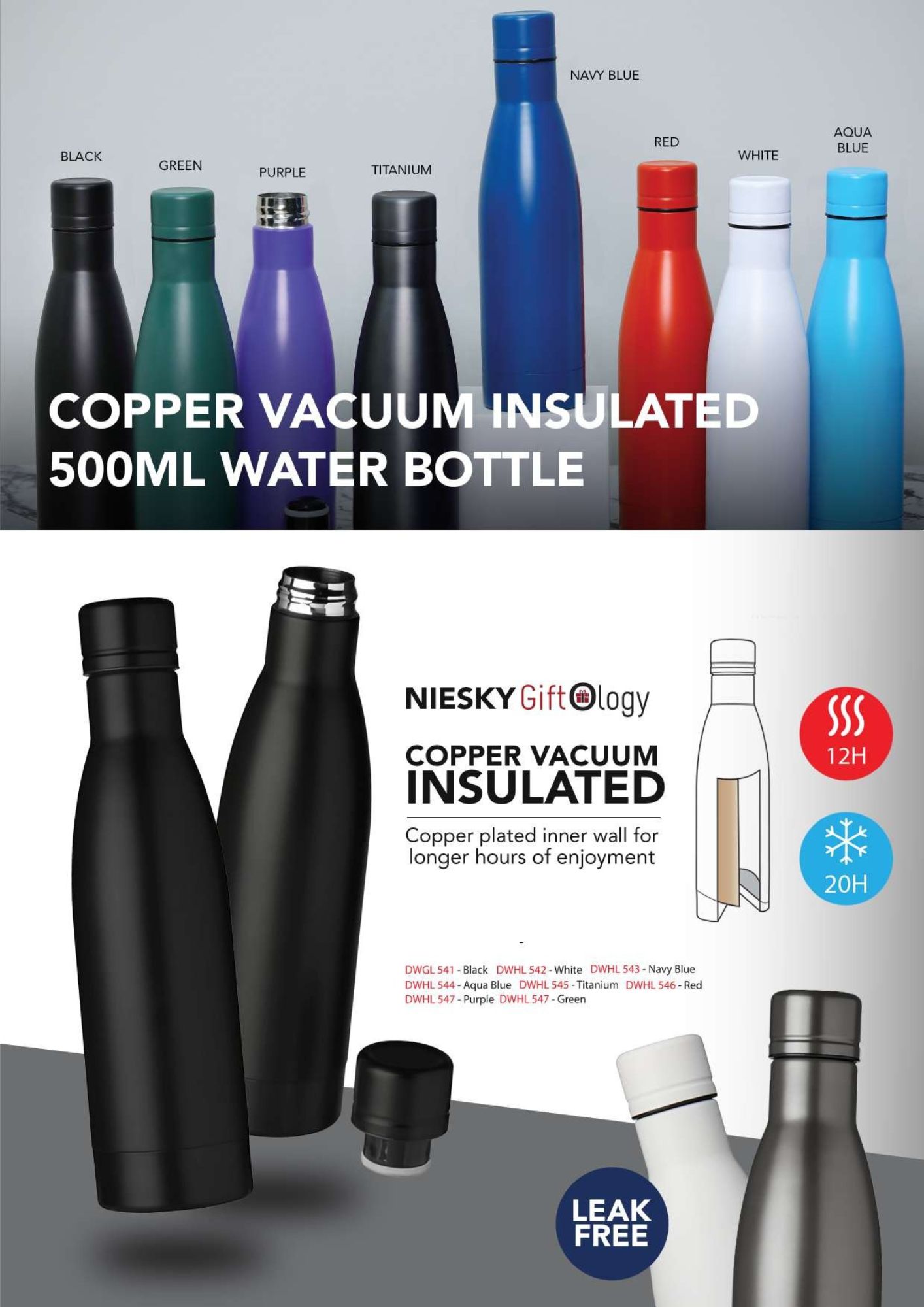Giftology Copper Vacuum Insulated 500ML Water Bottle
