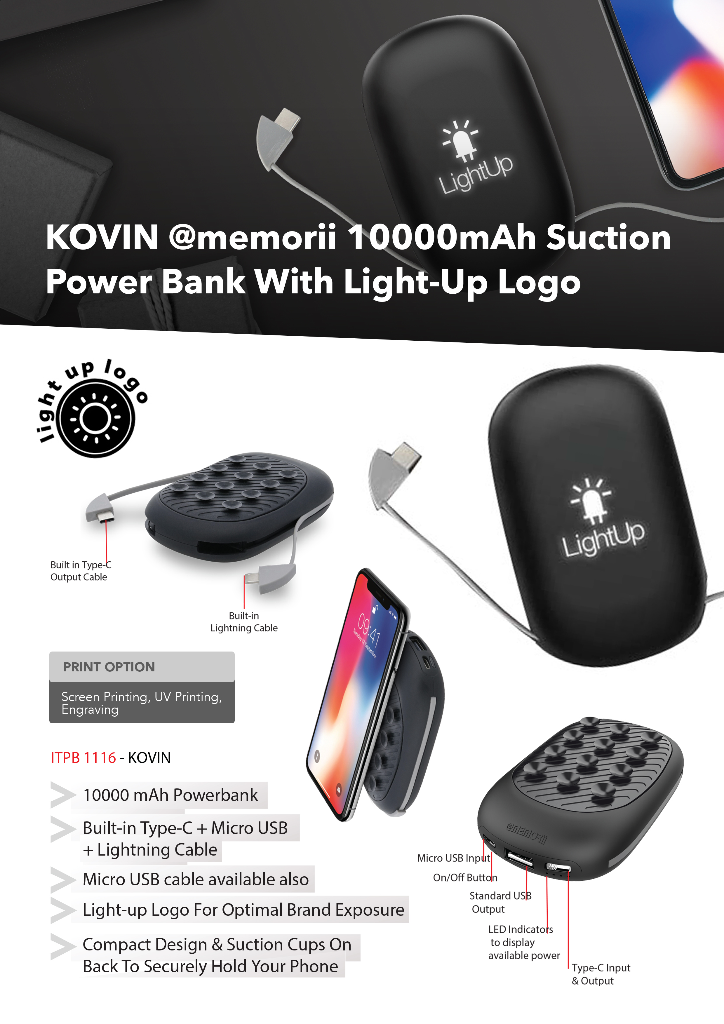 Kovin 1000mAh Suction Power Bank with Light-Up Logo